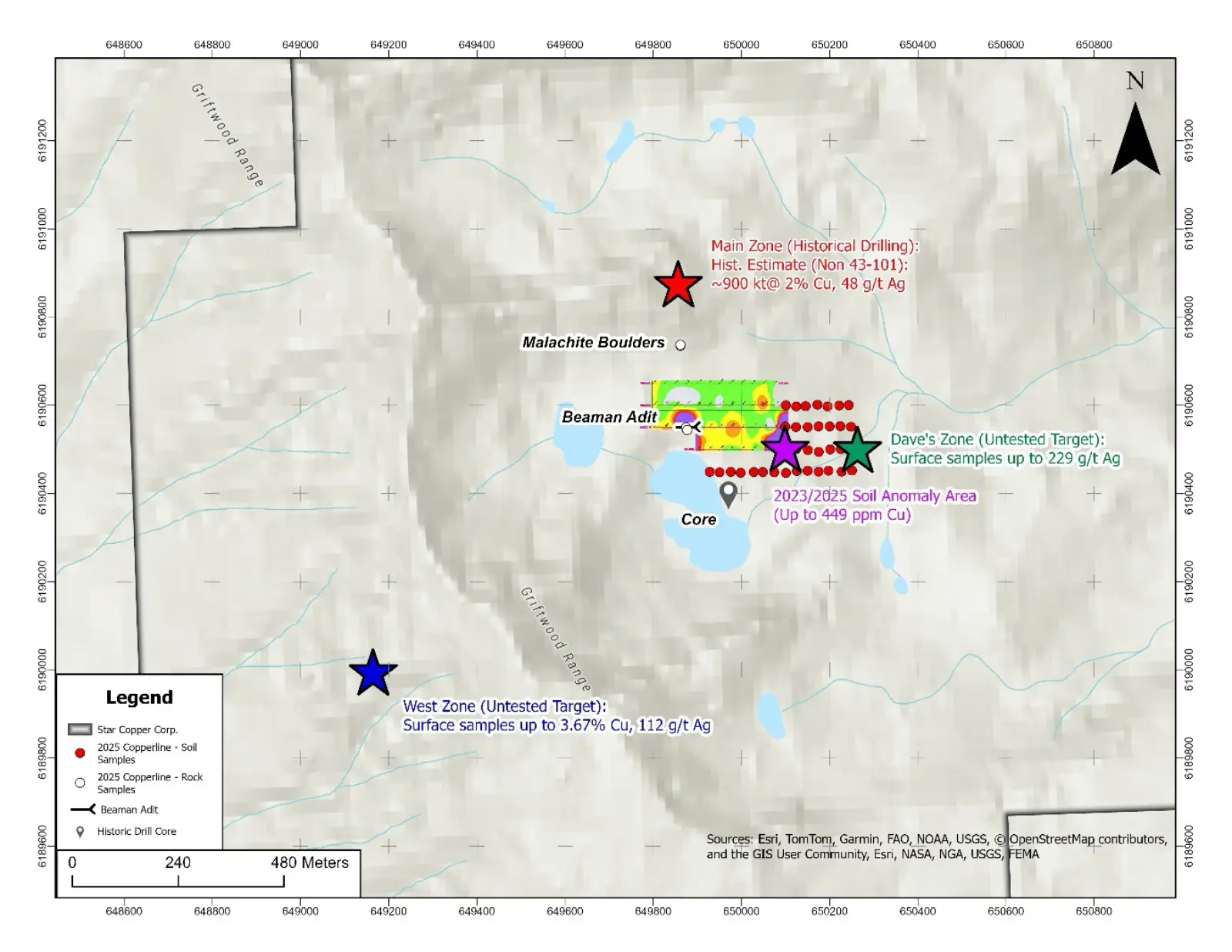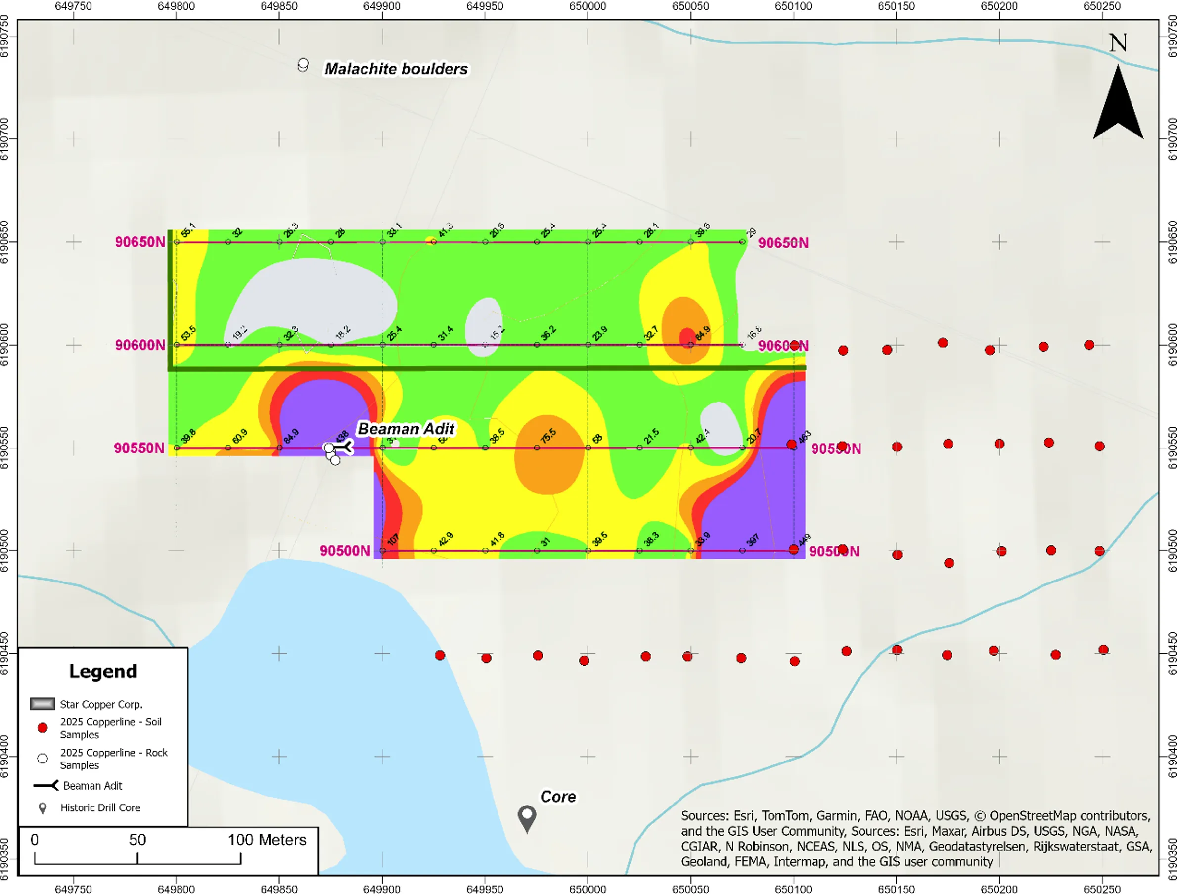 The 2025 soil sampling program was designed to follow up on anomalous copper-in-soil results identified during the 2023 program (Rodway, 2023). The 2023 program returned highly anomalous copper values in the southeastern portion of the grid, including results of 449 ppm Cu and 463 ppm Cu, with anomalies remaining open to the east and south.