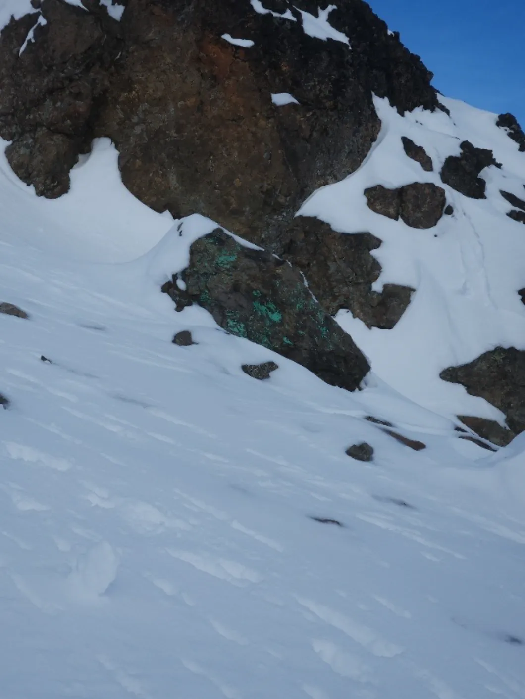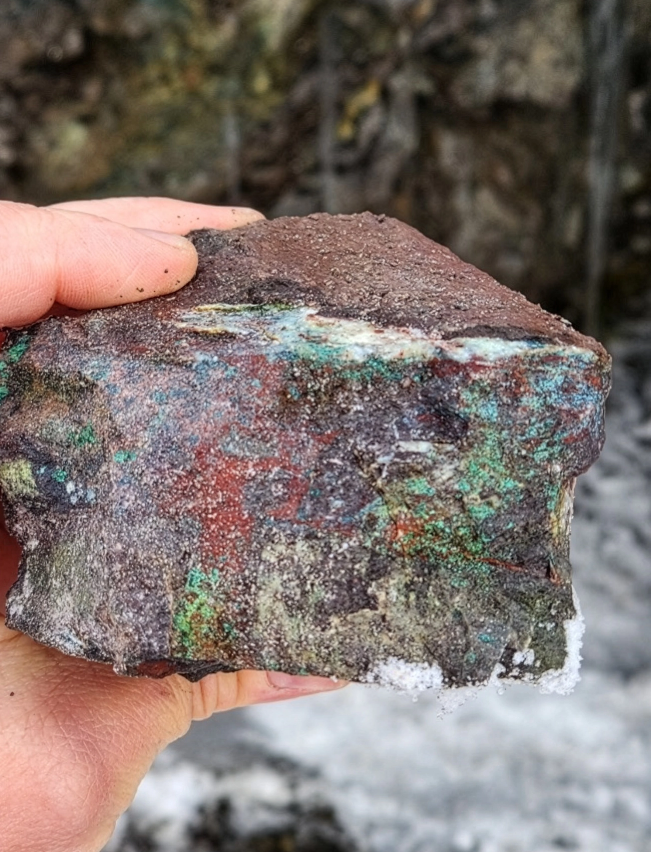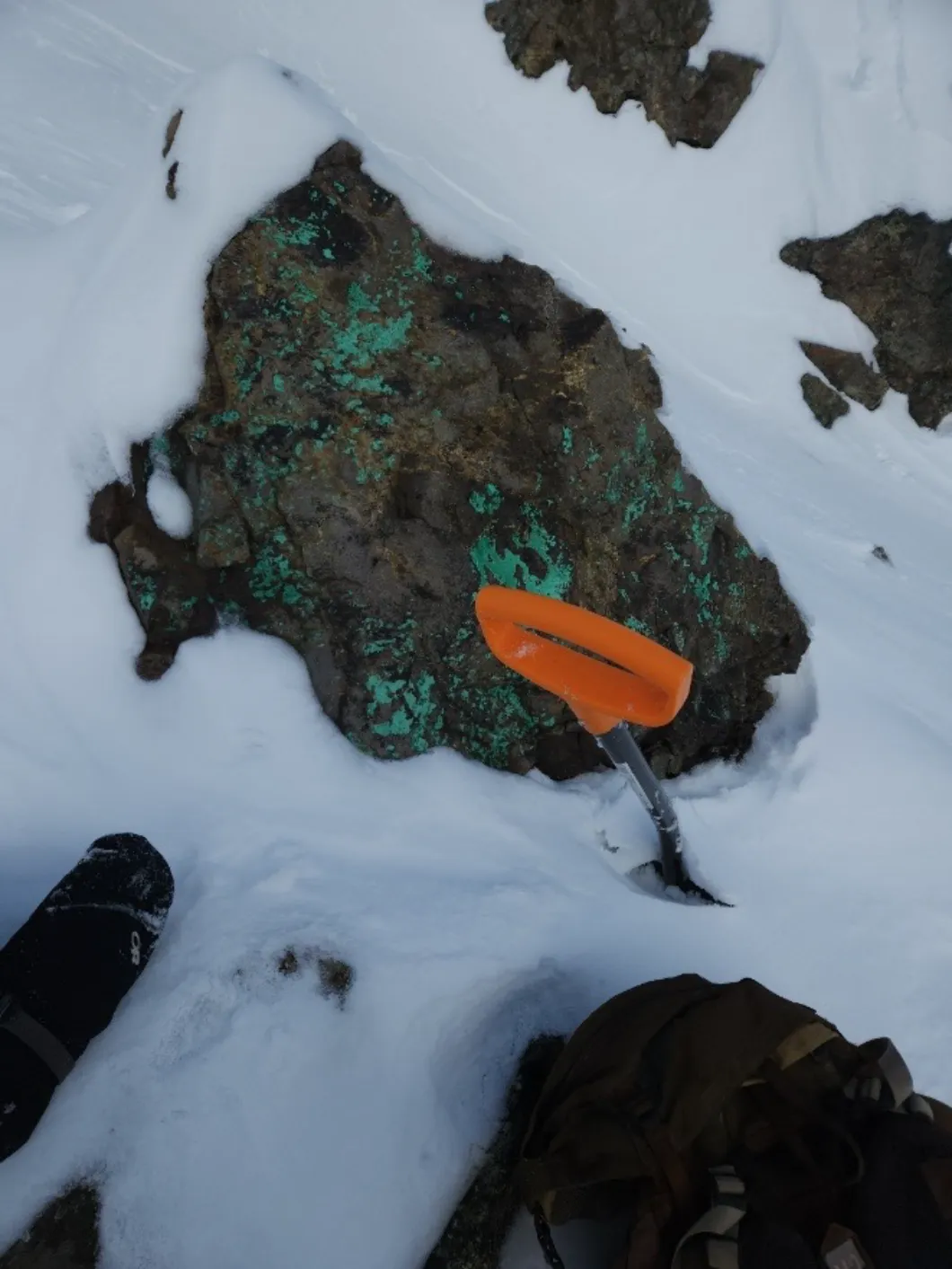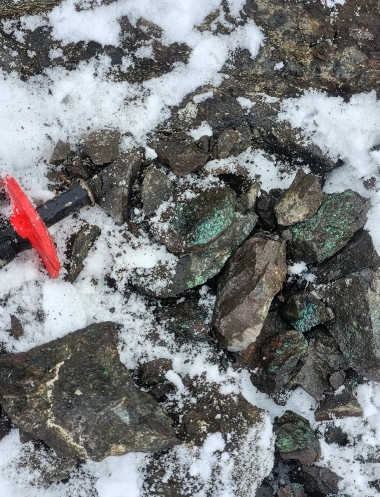 While attempting to access historic trenches (obscured by snow), the field crew observed large boulders with visible malachite on slopes below the historic Main Zone. Two grab samples were collected. These boulders are interpreted as talus likely derived from the Main Zone mineralization upslope, providing additional confirmation of copper mineralization in the area.
