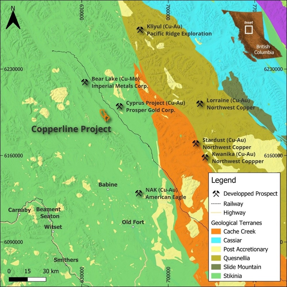 The Copperline Property comprises 6 mineral tenures totalling 945 hectares in the Omineca Mining Division of British Columbia. The property is located at Latitude 55°50’N, Longitude 126°36’W (NTS 93M/15E), approximately 120 km north-northeast of Smithers. Access is by helicopter from Smithers or via logging roads extending from the Nilkitkwa River area.