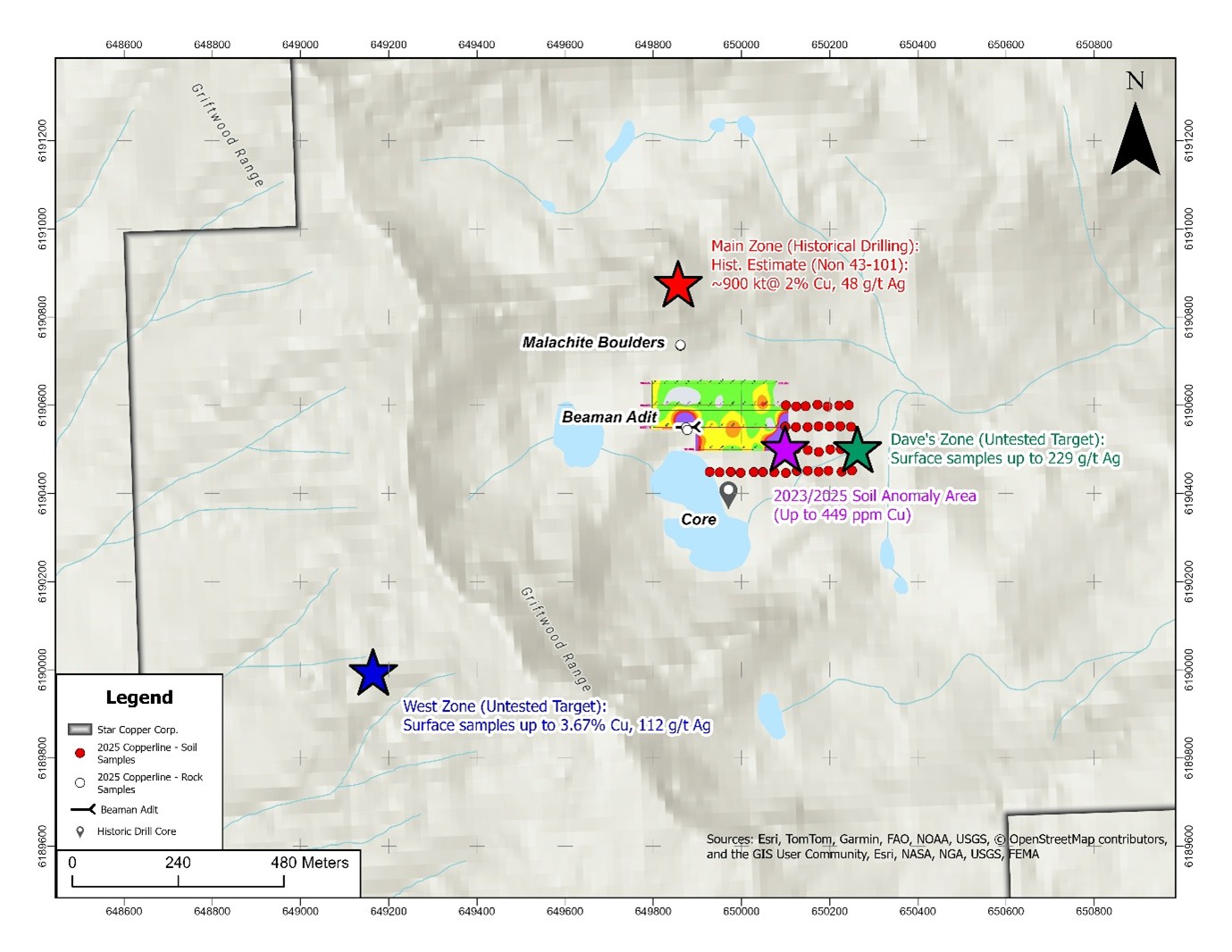 On October 30, 2025, Star Copper completed its inaugural reconnaissance field program on the 945-hectare Copperline Property, located approximately 120 km north-northeast of Smithers, British Columbia. The program successfully confirmed historic copper-silver mineralization and collected infill soil samples designed to test extensions of known geochemical anomalies. Assay results are pending.