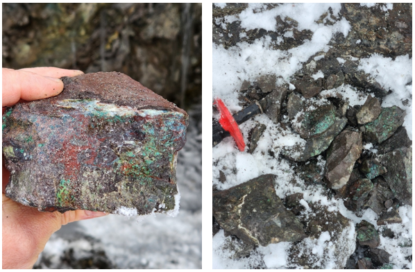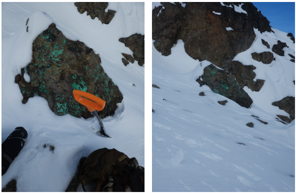 While attempting to access historic trenches (obscured by snow), the field crew observed large boulders with visible malachite on slopes below the historic Main Zone. Two grab samples were collected. These boulders are interpreted as talus likely derived from the Main Zone mineralization upslope, providing additional confirmation of copper mineralization in the area.