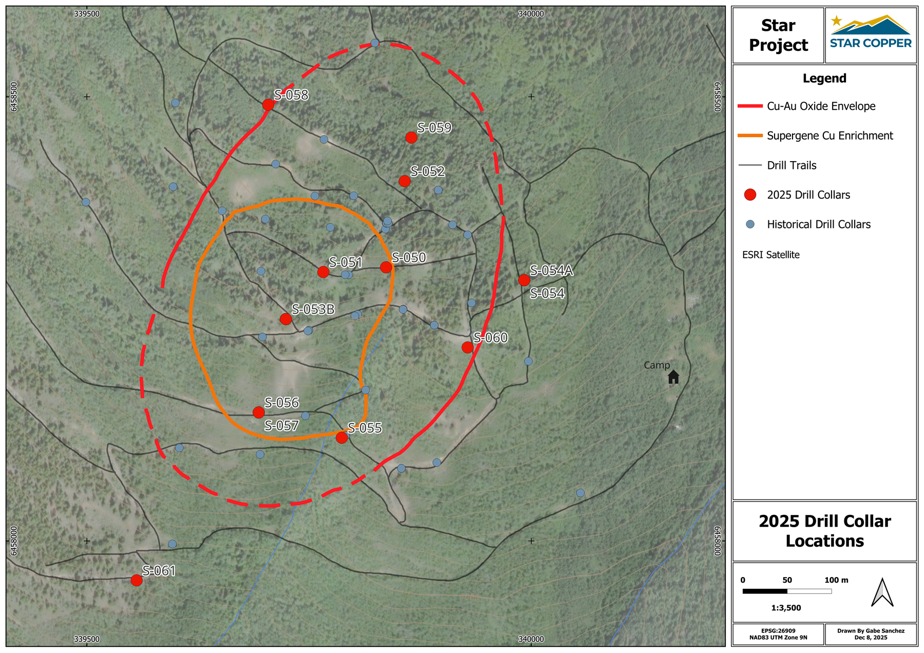 Company CEO, Daryl Jones notes, “Building off strong fundamentals, we raised over $17 million to fund a clear set of exploration objectives. Our technical team effectively reprocessed existing geophysical data to produce 3D magnetic inversion models, which produced a nested porphyry model, which in turn guided 4,900 meters of targeted drilling across two preplanned phases. A total of 13 holes were drilled, which expanded the Star Main supergene oxidized deposit to roughly 500 meters x 550 meters x 100 meters deep, demonstrated a consistent transition from supergene to hypogene mineralization below 200 meters, verified that mineralization is still open below depths of at least 500 meters, and perhaps most importantly, significantly expanded the known areas of mineralization in multiple directions up to 2.5 kilometers from the Star Main asset onwards to our Copper Creek and Star North project areas. The Company then capped off 2025 with another progressive financing which positions the Company to exit 2025 with nearly $10 million in cash on the balance sheet. All this activity packed into one exploration season truly sets the stage for an exciting year ahead.”