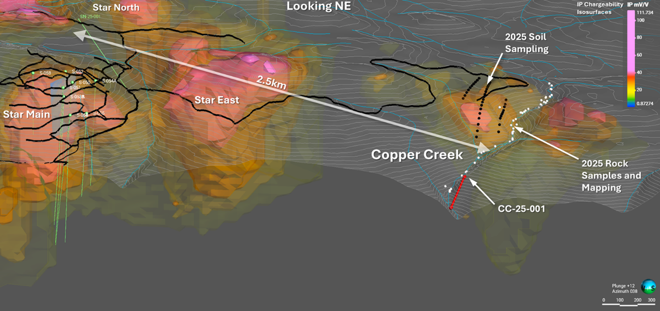 Star Main drilling in Phase 2 centered around the relationship between supergene to hypogene transition and the structures that carry the mineralization. Copper Creek is a historically drilled target 2.2 km Southeast of the Star Main deposit and has a very strong soil signature associated with a coincident chargeability high similar to Star Main. One hole was drilled to a depth of 120 m and intersected strong VMS mineralization over a broad intercept at the target depth. Star North, which is another strong soil anomaly and coincidental chargeability high, located 1 km northeast of the Star Main saw 400m of drilling to test the structure to allow for further drilling to expand the target in 2026. Star Main also saw additional follow up drilling during phase 2 to confirm the hypogene mineralization and expand the overall deposit model. A total of 13 holes were drilled at Star Main with 11 assays still pending.