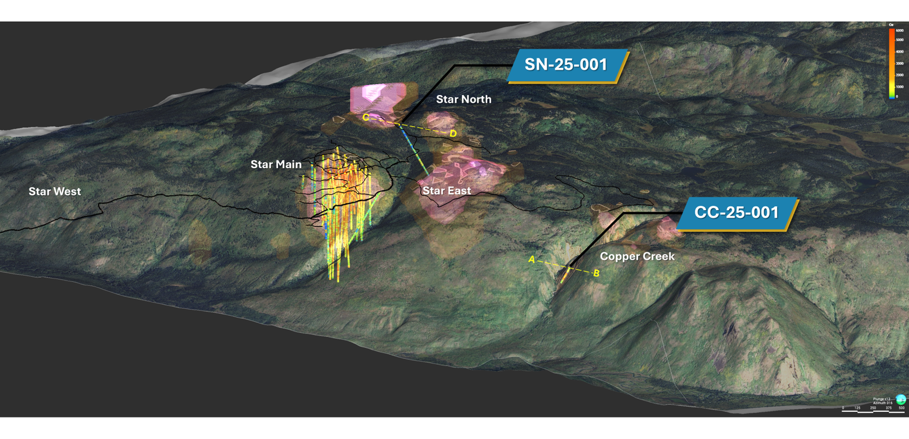 - CC-25-001 confirms that Copper Creek hosts broad, structurally controlled copper-gold mineralization and validates the target as a priority satellite discovery opportunity outside Star Main.