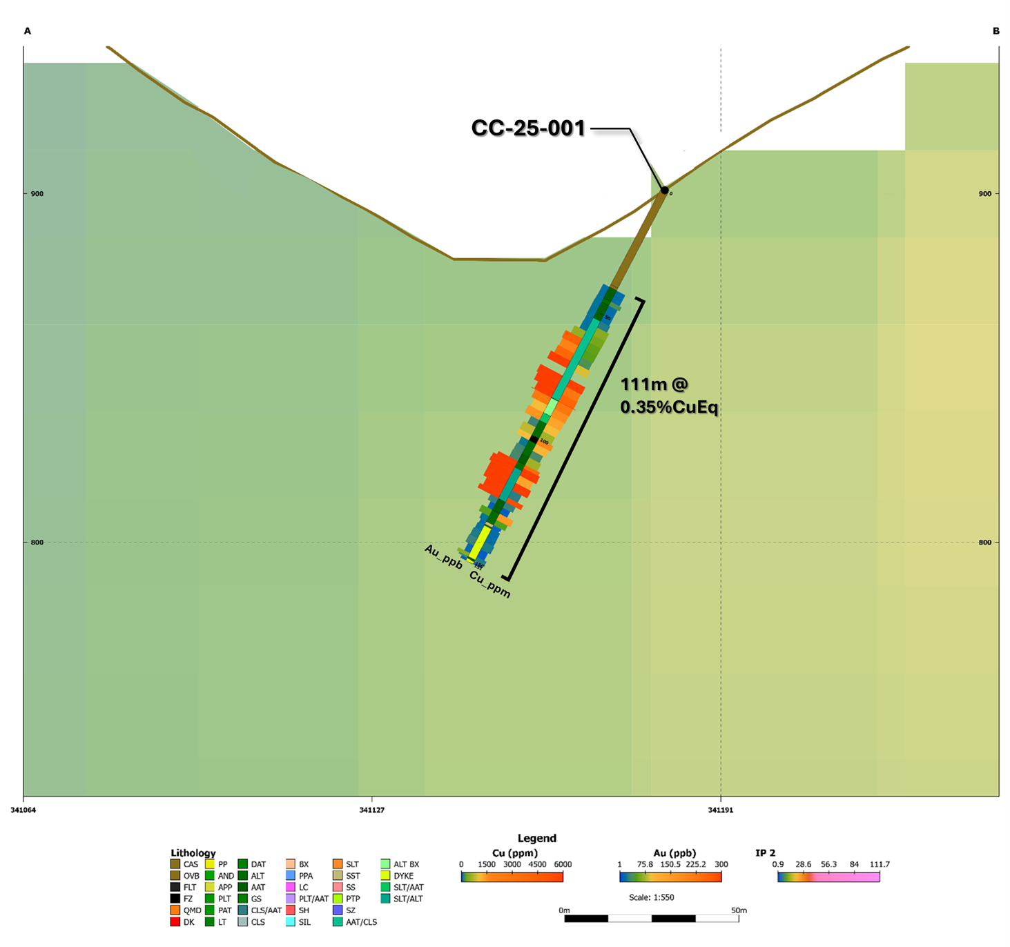 - CC-25-001 intersected 111.00m of 0.348% CuEq (0.178% Cu and 0.167 g/t Au) from 40.00m.