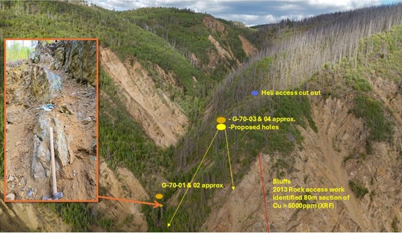 The helicopter-supported drill program is scheduled to begin following completion of pad construction. Two initial holes, totaling approximately 400 metres, are planned to test: